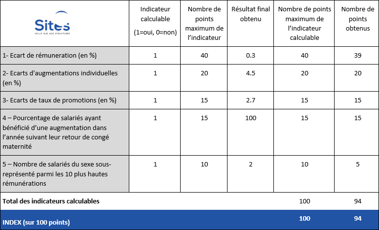 Conformément à la législation en vigueur, SITES vient de calculer son Index égalité Hommes-Femmes 2025. Sur un total de 100 points maximum, l’index égalité Hommes-Femmes 2025 atteint 94 points. Ci-dessous le détail :