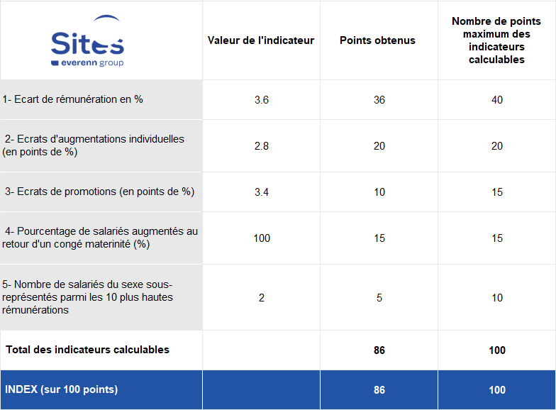 Conformément à la législation en vigueur, SITES vient de calculer son Index égalité Hommes-Femmes 2026. Sur un total de 100 points maximum, l’index égalité Hommes-Femmes 2026 atteint 86 points. Ci-dessous le détail :